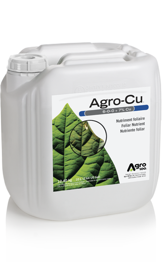 Agro-Cu aumenta el contenido de cobre de las células y, gracias a esto, mejora el crecimiento vegetativo mediante una fotosíntesis mayor, mejor asimilación del nitrógeno, agostamiento de la madera por su efecto en la síntesis de la lignina, relleno de las espigas y alto peso específico, resistencia del cultivo a las enfermedades y al estrés abiótico. Agro-Cu puede aplicarse durante todo el ciclo de crecimiento, pero es importante dar preferencia a las aportaciones precoces para ayudar a los cultivos sensibles.